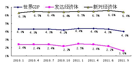 世界經(jīng)濟在經(jīng)歷2010年“脆弱而不平衡”的復蘇后,進入2011年,這種復蘇再度遭遇挫折,形勢也變得更為復雜多變。從利比亞、敘利亞、埃及和也門為代表的中東地區(qū)政治危機,到日本地震重創(chuàng)世界供應鏈,到歐債危機不斷深化,再到標準普爾下調(diào)美債評級。一系列經(jīng)濟政治事件使得全球經(jīng)濟動蕩不安,下行風險也不斷加大。2011年9月IMF大幅下調(diào)今明兩年全球經(jīng)濟增速預期,分別下調(diào)0.3%及0.5%,均降至4%的水平;發(fā)達經(jīng)濟體今年的經(jīng)濟增長率由此前預計的2.2%下調(diào)至1.6%,2012年的增長率由此前的2.6%下調(diào)至1.9%;新興及發(fā)展中經(jīng)濟體的經(jīng)濟增長率由6.6%及6.4%分別下調(diào)至6.4%和6.1%。