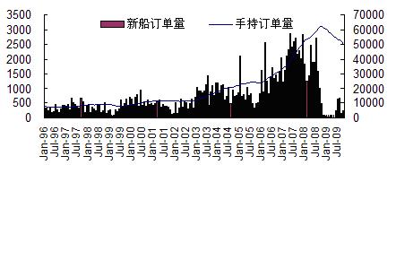 據(jù)英國克拉克松公司統(tǒng)計(jì),今年1-10月全球累計(jì)成交新船261艘、2189萬載重噸,同比下降85.3%;截止到2009年10月底,全球手持船舶訂單總量降至8422艘、5.01億載重噸,以載重噸計(jì),較去年10月底歷史最高位下降了20%。