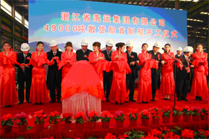 2012年2月24日上午10時28分,浙江省海運(yùn)集團(tuán)有限公司4.9萬噸散貨船首制船開工儀式在舟山五洲船舶修造有限公司隆重舉行。中國船級社副總裁兼上海分社總經(jīng)理莫鑒輝和省、市海事局、浙江省海運(yùn)集團(tuán)、上海佳豪船舶工程設(shè)計股份有限公司以及有關(guān)單位領(lǐng)導(dǎo)出席了開工儀式。