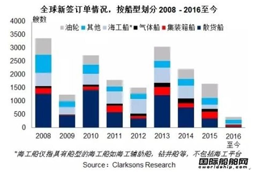 支撐散貨船訂單量的基本只有在中國船廠訂造的30艘Valemax型礦砂船。油輪新簽訂單僅成交117艘,同比下降76%,尤其是大型原油油輪訂單明顯減少。盡管有一些特殊油輪訂單如小型化學品船及瀝青船等,但其體量對總訂單量的貢獻仍然有限。集裝箱船訂單的情況與油輪類似,從數(shù)量來看同比下滑72%,市場對大型集裝箱船的興趣明顯減弱,3,300TEU以上的訂單僅成交5艘。與此同時,巴拿馬運河的拓寬、韓進海運的破產、集運聯(lián)盟的整合、兼并等,更是增加了集裝箱船市場的不確定性。今年的新簽訂單主要集中在一些特殊船型領域,如受船隊更新需求影響,歐洲船東訂立的一批客滾船訂單等。豪華郵輪訂單尤為顯眼,共計有32艘簽訂,已超過2014及2015年的總量,其訂單總價值占全球新簽訂單總額的約一半。