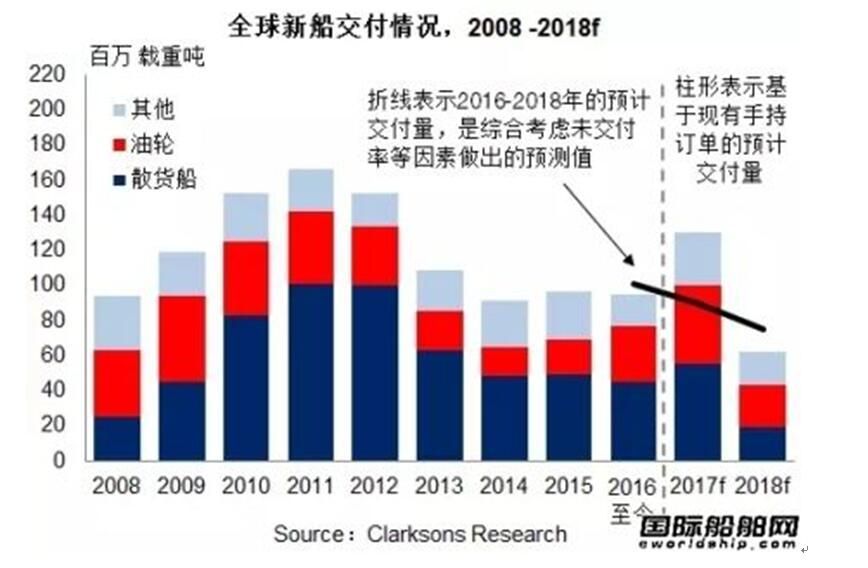 在新簽訂單量大幅減少和交付量穩(wěn)定的共同作用下,全球手持訂單量加速縮水:2016年12月初手持訂單量為3,713艘,2.3億載重噸,較年初相比縮減27%。按數(shù)量統(tǒng)計,散貨船仍占手持訂單的27%,油輪和集裝箱船則分別為23%和11%。如果以2015年的產能為基準粗略估計,當前的手持訂單量僅能平均維持船廠未來2.4年的生產。(來源:克拉克森研究)